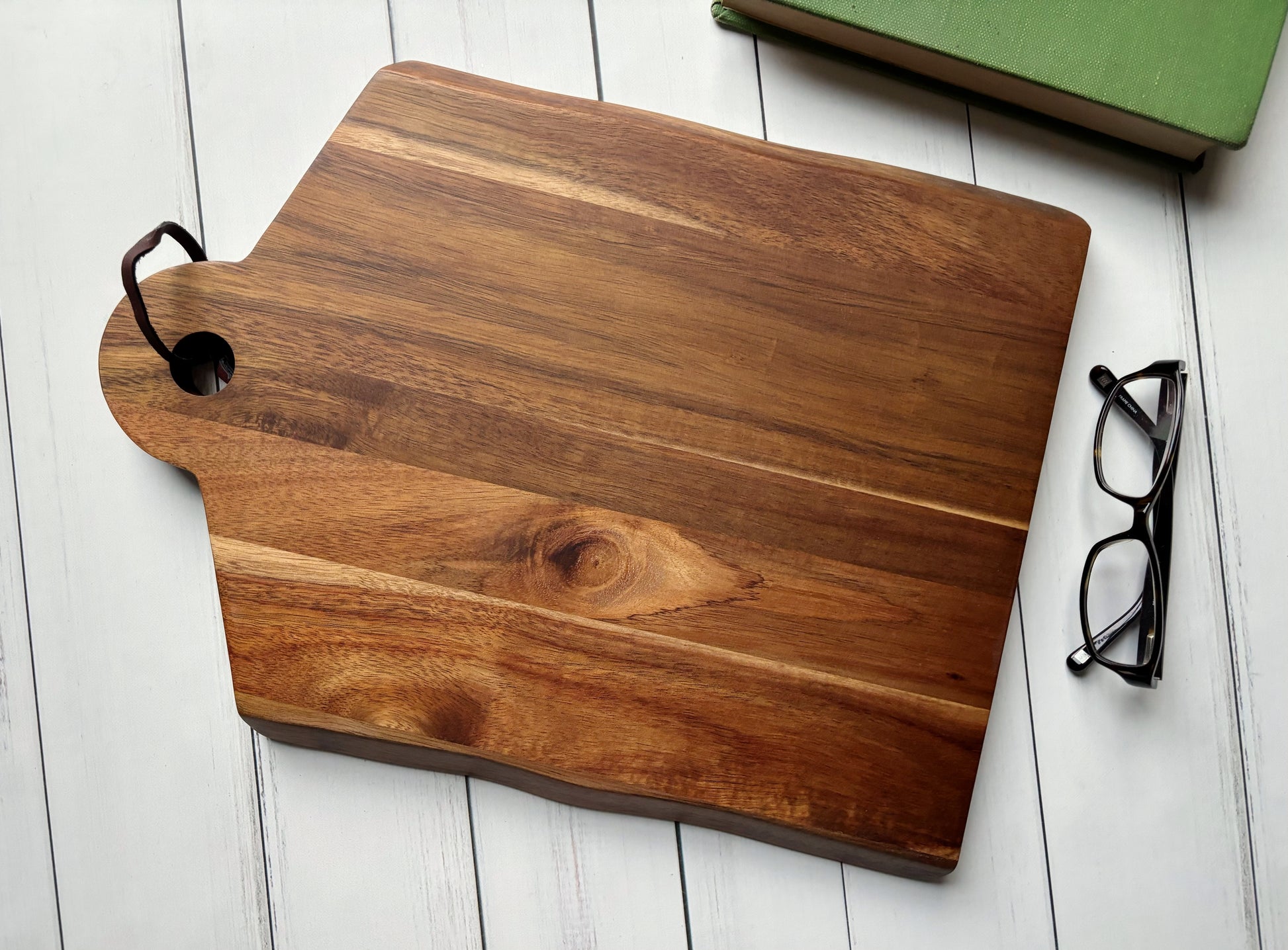 This rustic styled wood cutting board is crafted from acacia wood and showcases stunning wood grain. The 14 inch x 11 inch cutting board is ideal cutting and food display; leather loop on the handle allows board to hang for convenient storage.
